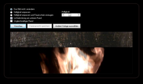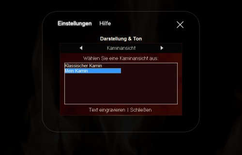 14. Jetzt kommt der große Augenblick. Führen Sie Kaminfeuer Comprehensive Edition 1080 aus. Öffnen Sie das Menü und wählen Sie als Darstellung "Kaminansicht" aus. Es öffnet sich ein Fenster, in welchem auch Ihre neue Kaminansicht zu finden ist: