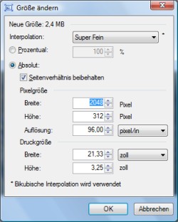 7. Der gewählte Ausschnitt ist jetzt ein neues Bild. Ändern Sie die Bildgröße auf eine Breite von 2048 Pixel (Bild - Größe ändern). Achten Sie darauf, dass die Option "Seitenverhältnis beibehalten" aktiviert ist und wählen Sie "Ok":