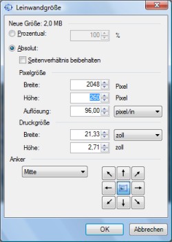 8. Rufen Sie nun "Bild - Zeichnungsbereichgröße" auf. Deaktivieren Sie hier die Option "Seitenverhältnis beibehalten". Ändern Sie anschließend die Leindwandgröße auf 2048x260 Pixel und wählen Sie "Ok":