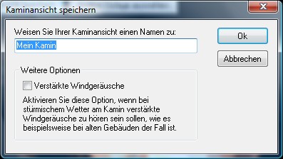 13. Klicken Sie auf "Kaminansicht speichern", sobald Sie mit dem Ergebnis zufrieden sind. Jetzt müssen Sie nur noch einen Namen für Ihre Kaminansicht eingeben. Wenn es sich um einen alten, "rustikalen" Kamin handelt, empfiehlt sich die Aktivierung der Option "Verstärkte Windgeräusche" – sie sorgt dafür, dass bei Sturm ein zusätzliches Pfeifen zu hören ist. Wählen Sie zum Speichern der Kaminansicht "Ok":