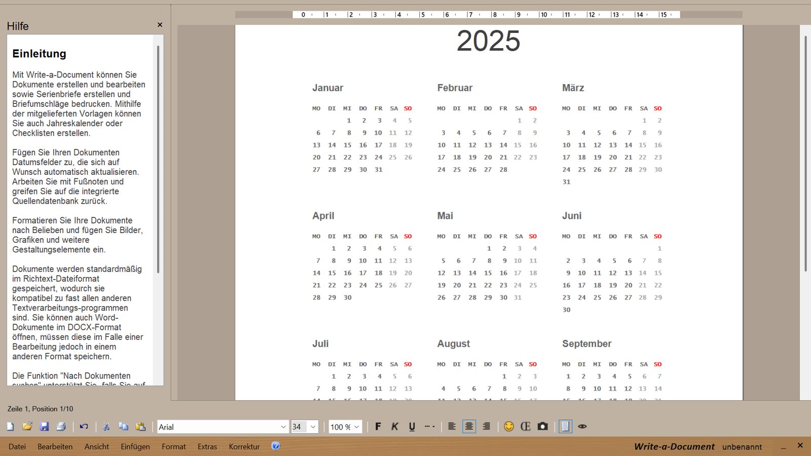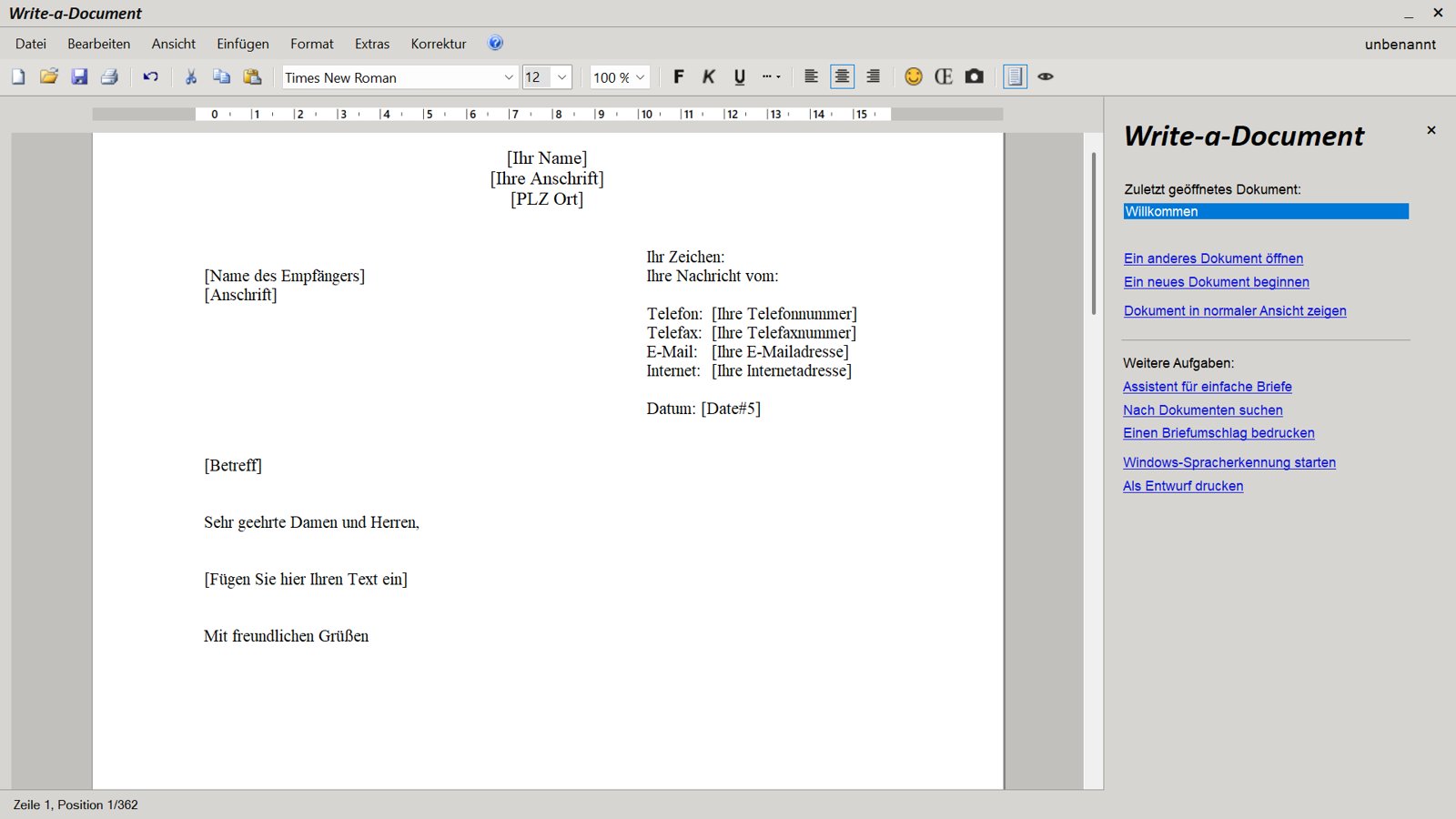 Mit Write-a-Document erstellte Dokumente sind mit den meisten anderen Textverarbeitungsprogrammen kompatibel. Umgekehrt können Sie auch Word-Dokumente öffnen.3) Wenn Sie bereits mit einem Textverarbeitungsprogramm gearbeitet haben, werden Sie sich schnell zurecht finden.